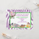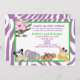 Super fun and cute, our Party Animals invitation features our jungle graphics with purple bows, a purple zebra stripe with lime green border and even a cupcake with a #3 candle on the back! If you would like a different number on the back, please email us and we will list one for you. Click our banner at the top of the page to return to our Zazzle homepage --> click the "Send Message" link in the left column or look us up on our website www.ArtbyJess.com for our phone number. Matching items available!!