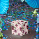 Party favour box is shown in a lovely roses print with a white ribbon bow.