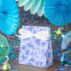 Party favour box shown in a lovely blue hydrangeas print. Customise this item or buy as is.
