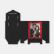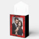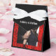 Party favour box is shown in black with a white ribbon bow and with red roses on the front with your custom photo.