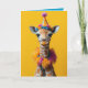 A charming baby giraffe dressed up for a celebration, wearing a festive party hat with colourful patterns and fluffy decorations. The giraffe sports a fluffy, multicolored feather boa and stands against a bright yellow background, creating a joyful and whimsical scene.