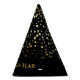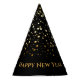 This party hat is shown in a Black colour with a print of fun Golden petite stars all over it. Text in coordinating colour states Happy New Year.