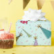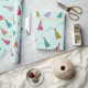 This is a playful, colourful wrapping paper features party hats, noisemakers, and confetti on a light blue background. The party hats come in various colours and patterns—stripes, polka dots, and solids—with festive toppers. Scattered noisemakers and vibrant confetti pieces add to the celebratory, whimsical vibe. It’s a cheerful design perfect for a birthday party or any celebration event.