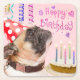 Fun party coasters with a cute pug wearing a spotty party hat celebrating someone's birthday with candles, cake and streamers.