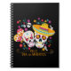 Feliz Dia De Muertos with Party Sugar Skulls - one wearing a Sombrero , colourful flowers and Maracas to show the Happy Mexican Celebration of the Day of the Dead on November 1