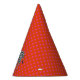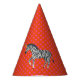 A bold and bright orange-red with fuchsia pink dotted party hat features a party zebra to make it a fun addition to any kid's safari themed birthday celebration.