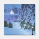 A 3D fantasy landscape full of shimmering snow and magical fairy lights. A row of silvery shining lamps lights the trail through a snowy mountain pass hemmed in by steep rocky cliffs. The sparkling snow-covered path is hemmed in by dark fir trees. On the far side of the cleft a translucent glowing fairy castle awaits the enchanted traveller on his journey to fairyland.