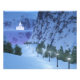 A 3D fantasy landscape full of shimmering snow and magical fairy lights. A row of silvery shining lamps lights the trail through a snowy mountain pass hemmed in by steep rocky cliffs. The sparkling snow-covered path is hemmed in by dark fir trees. On the far side of the cleft a translucent glowing fairy castle awaits the enchanted traveller on his journey to fairyland.
