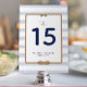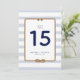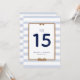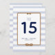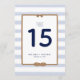 Nautical Boutique Co.'s modern nautical event / wedding table number design features a rope tied into an infinity knot and traditional block typography paired with modern handwritten typography. The design is set on a matching watercolor background in pastel blue and white stripes. #Nautical #CoastalWedding #Wedding #BeachWedding