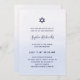 These stylish and trendy Bat Mitzvah or Bar Mitzvah invitations feature a light blue ombre watercolor wash background. Your information appears in a mix of darker, navy blue handwritten script typography and modern sans serif text, and there is also a Star of David.