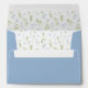 Rustic elegance is captured in these modern envelopes, adorned with delicate blue spring flowers and greenery leaves, perfect for wedding invitations or save-the-date announcements.