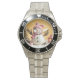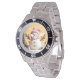 Has heft and feel of expensive stainless steel quartz watches. Good band with safety catch. I removed links, which is easy because engraved arrows show direction to push the linking pins. As always by this seller, the image (a railroad logo) is a perfect reproduction of my emailed image, and is precisely spaced and aligned.