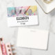 A name tag with a pretty pastel coloured photograph. Featuring cake decorating items in pastel blue, pink, peach and yellow. Set upon a wood table with little colourful beads.