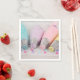 Paper napkins with a pretty pastel coloured photograph. Featuring cake decorating items in pastel blue, pink, peach and yellow. Set upon a wood table with little colourful beads.