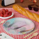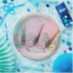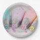 Paper plates with a pretty pastel coloured photograph. Featuring cake decorating items in pastel blue, pink, peach and yellow. Set upon a wood table with little colourful beads.