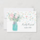 A whimsical blue green mason jar holds pale pink and white flowers with soft teal greenery on the front of this wedding RSVP card. A background of pastel pink and blue confetti combines with gold flecks to add interest and contrast to the delicate flowers. Your custom text is in darker teal. The back of the invitation is solid white to make it easy for your respondent to mark. Be sure to see the matching wedding invitations in our store. *This design uses artwork from LABFcreations on Etsy.