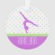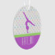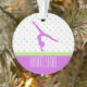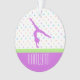 This gymnastics design features a white background covered in pastel coloured polka-dots. There is a gymnast in a pose in the foreground and a custom text field to personalise with a name before ordering.