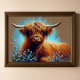 Pastel Drawing Highland Cow Blue Flowers Poster