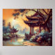 Pastel Drawing of Ancient Chinese Pagoda Village Poster