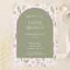 Easter brunch invitation card featuring a featuring a background of watercolor pastel pink, yellow and green Easter eggs adorned with intricate details, accompanied by soft green foliage. A green shade serves as backdrop for a customisable Easter brunch text. Green colour repeated on reverse. A festive invitation to your next Easter gathering.