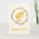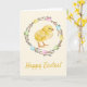 Destei's watercolor illustration featuring a yellow baby chick nestled inside a willow wreath. The wreath is decorated with colorful pastel Easter eggs. The background color is light yellow.