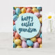 This card features a soft pastel scene that feels like a gentle Easter celebration shared between close family members. In the middle sits a light blue circular badge, like a small sign set into the design, drawing the eye right away. The words “happy easter grandson” are centered on the badge in darker blue lettering, arranged neatly to feel close and affectionate. Around the circle, dozens of small oval egg shapes crowd in like a cozy nest, suggesting a sweet little find from a springtime hunt 🐰. The eggs mix pale blue, pink, buttery yellow, creamy ivory, and peach tones, and their smooth, slightly matte finish gives them a candy-like look. The tight, close-up view makes the eggs feel gathered together, as if they’re leaning in around the message like a warm group hug 🌷. Soft, diffused light falls across the cluster, with the central blue circle staying crisp while the surrounding eggs blur slightly at the edges.