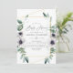 Trendy geometric eucalyptus greenery and poppy flowers in pastel shades shades of purple baby shower invitation with gold geometric frame and mint watercolor wash reverse.