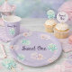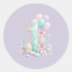 Elegant round first birthday sticker in a soft pastel fairytale style with a delicate number one illustration and dreamy lilac palette. Perfect for envelope seals, favour bags, party stickers, and sweet one birthday decorations for a girl’s first birthday celebration.