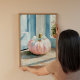 Bring a soft, whimsical touch to your fall decorating with this Pink Pumpkin with Bow Wall Art. Featuring a delicate pastel pink pumpkin adorned with a blue ribbon, resting by a sunlit doorway, this artwork captures the cosy charm of autumn with a fresh and modern pastel palette.
