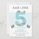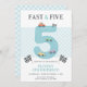 Adorable pastel racetrack shaped as number five with colourful cars, chequered flags, and watercolor details. Perfect for a boy’s fifth birthday celebration in a playful style.