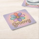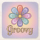 This coaster features a cute retro-inspired image of a stylised flower with rounded petals in a dreamy palette of pastel pink, blue and lavender with shimmering metallic gold accents. The flower is centred against a soft, gradient background that shifts from a pale lavender to a gentle pink and yellow. Below the flower the word Groovy is centred in classic metallic gold lettering. The coaster is a square paper pulp coaster. There are six coasters in the coaster set.