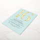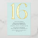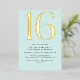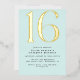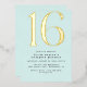 Modern style 16th birthday invitations with a large heading "16" in real metallic foil on a pretty pale blue background. (Background colours can be changed by using the design tool. You can also change the type of metallic foil.)