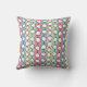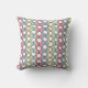 This throw pillow has a mid-century modern design of white “deformed” circles connected with black lines on a field of pale green, pale pink, pale blue, and pale yellow strips. If you like the design but prefer different colours, message me.