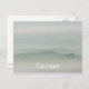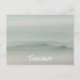Postcard of a pastel colored landscape with the silhouettes of two houses and rows of cypress trees surrounded by patches of foggy during a sunrise in the early morning in Val d'Orcia Valley in Tuscany, Italy with the text 'Tuscany'