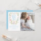 This birth announcement features a nativity image of baby Jesus sleeping in a manger with Mary and Joseph in the center surrounded by a the wise men and two angels. The top has a greeting that says "For unto us a child is born." This would make a great Christmas card to announce the arrival of a new baby.