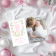 This birth announcement features a nativity image of baby Jesus sleeping in a manger with Mary and Joseph in the center surrounded by a the wise men and two angels. The top has a greeting that says "For unto us a child is born." This would make a great Christmas card to announce the arrival of a new baby.