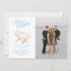 This Christmas card features a nativity image of baby Jesus sleeping in a manger. The top has a greeting that says "Hark the Harold Angels Sing." You can personalize with names and a year.
