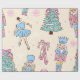 A charming holiday artwork inspired by the Nutcracker story, featuring pastel colored soldiers, graceful ballerinas, festive Christmas trees topped with bows, ballet slippers, peppermint candies, and delicate snowflakes. Soft tones and whimsical hand drawn lines create a magical, nostalgic, and cheerful seasonal atmosphere full of classic Christmas charm.