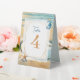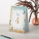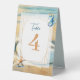 Elegant romantic oceanic coastal themed wedding reception table number sign. Soft pastel brown sand pale blue water with a sand dollar on the beach. Watercolor seahorse and starfish.