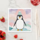 This charming illustration features a whimsical penguin centered against a backdrop of soft, overlapping semicircular hills. The palette is a gentle dreamscape of pastel pinks, lavenders, and mint greens, executed with a delicate watercolor texture that suggests a snowy, magical landscape. The penguin itself wears a cozy, patterned teal beanie, adding a touch of personality and warmth to the cool setting. Subtle gold leaf accents in the sky and on a floating celestial sphere provide a hint of fairy-tale elegance, blending minimalist character design with folk-art inspired patterns.