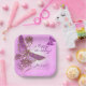 A Digitalbcon Images Design featuring a pastel pink, purple and white color theme with a variety of custom images, shapes, patterns, styles and text lettering in this one-of-a-kind Butterfly Paper Party Plates. This colorful and attractive design comes complete with custom text lettering to suit your special occasion. Makes a great Birthday Gift, Christmas Gift, Graduation or any other special occasion.