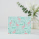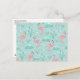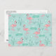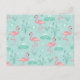 A postcard with a whimsical pattern. Pastel pink flamingos on a light green background. Green lily pads and lotus flowers. Cute tropical vibe.