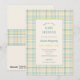 This neutral gender Pastel Plaid baby shower invitation combines soft teal, honey yellow and cream in a framed design with typography text.