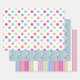 A fun assortment of luscious pastel colours adorn these coordinated wrapping sheets: polka dots, smaller polka dots with a light blue background, and matching stripes. This cohesive set of papers makes gift-giving fun! A mix of mint, fuschia, and coral brighten up any set of gifts.