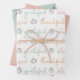 Set of three flat wrapping paper sheets, one each of: Thankful Grateful Blessed on white, solid pink, Pastel Pumpkins on green.
