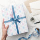 A sweet pattern featuring pink and blue puppies with mint green stars on a white background.