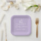 This personalised pretty pastel purple baby shower paper plate features elegant minimalist white typography below a cute rocking horse toy. Modern, simple script decor for a baby shower.