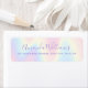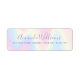 Return address labels with your name in an elegant calligraphy script font and the address below on a pastel rainbow background. Purple text. Change fonts and font colours with the customisation tool.