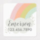 A whimsical kids label sticker featuring an arching pastel rainbow with white fluffy cloud and calligraphy Name and child's phone number beneath. Add this to variety of back to school items for easy labelling with personality and flair. Great for both hard or soft items like lunch boxes, water bottles, book bags, blankets, uniforms, shirts, jackets, towels and other personal items. Look for coordinating accessories and additional colour variations by Stacey Meacham.