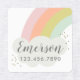 A whimsical kids iron label featuring an arching pastel rainbow with white fluffy cloud and calligraphy Name and child's phone number beneath. Add this to variety of back to school items for easy labelling with personality and flair. Great for blankets, uniforms, shirts, jackets, towels and other personal items. Look for coordinating accessories and additional colour variations by Stacey Meacham.